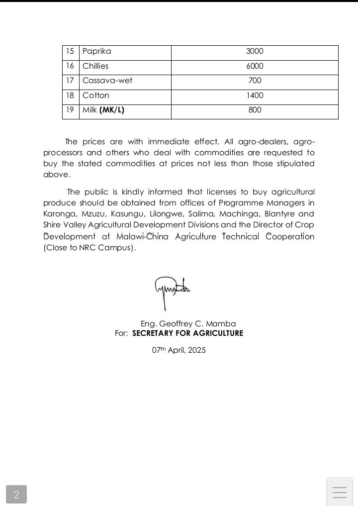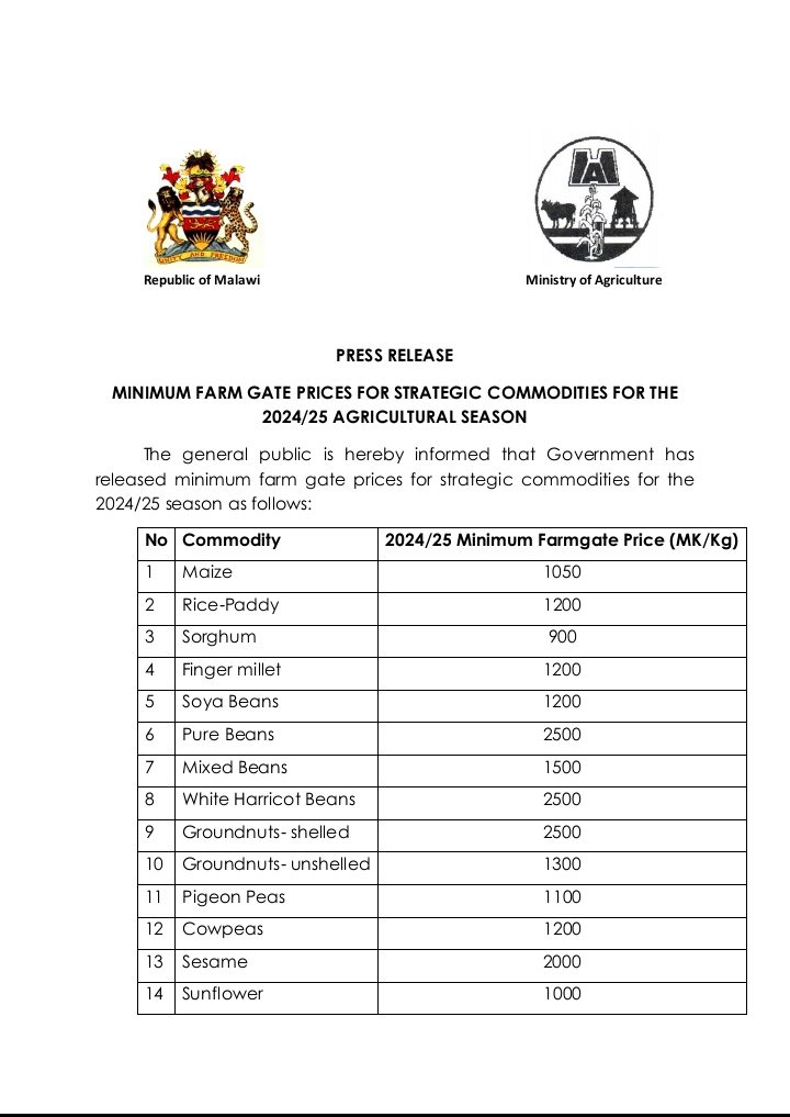 The government has released the prices where among others maize will be sold at 1050 kwacha per kilogram.
